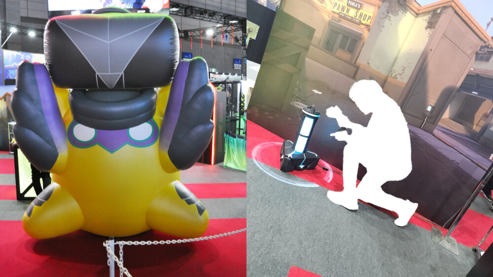 ゲーム内にも登場する武器スキンのショップ、ナイトマーケットが武器スキンカードになって登場。また、スパイクを抱えた巨大なバルーン・ウィングマンがユーザーを迎え、そのブース内にはスパイクが設置されたフォトスポットがあるなど、実際のゲームの世界を演出しています。