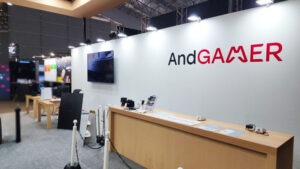様々なゲーミングデバイスを手掛ける「AndGAMER」では、注目のAIM1新製品「電 」「AIM1 Display」の展示が行われています。